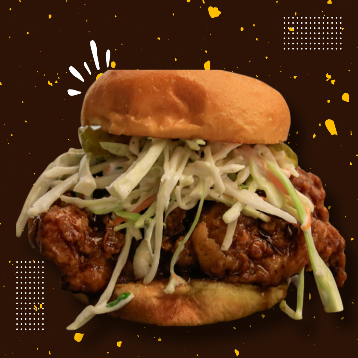 Deboned chicken dipped in honey garlic sauce,pickles, jalapeños and colesaw tossed in comeback sauce on brioche bun.